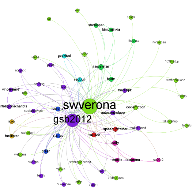 A conclusione dell’analisi quantitativa è utile evidenziare una visualizzazione degli hashtag che ricorrono più frequentemente e della loro associazione in coppie o triadi. Tralasciando gli hashtag ufficiali o suggeriti (#swverona e #gsb2012) è interessante rilevare l’importante presenza di due applicazioni che non sono risultate vincitrici ma evidentemente hanno raccolto consensi e popolarità (#sexmeter aka #pisellometro e #autocontrolloapp).