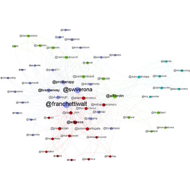 Si può osservare la centralità delle utenze “istituzionali”: @swverona (voce ufficiale su Twitter), @franchettiwalt, @aditecco e @simonesantagata (organizzatori), @juliusdesign (uno dei coach). @alfiero_tn invece, con 26 tweet inviati, si distingue per essere il vero e proprio social reporter della manifestazione. Per semplicità di visualizzazione nel network rappresentato sono stati riportati solamente i nodi più rilevanti per quanto riguarda il numero di interazioni intercorse.