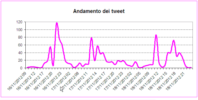 Si possono osservare quattro picchi, relativi ai pitch iniziali e finali e relativi all’ hashtag battle #gsb2012. La somma dei tweet raccolti durante questi momenti copre circa il un terzo dei tweet totali.