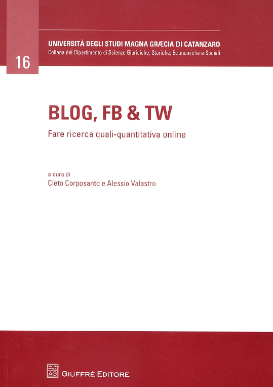 “Blog, Facebook e Twitter: fare ricerca quali-quantitativa online” raccoglie i contributi di 12 autori, rappresentanti del mondo accademico ma anche professionisti che operano al di fuori del mondo dell’Università. Dieci capitoli che spaziano dalla metodologia, ai survey e questionari online, alla sentiment analysis, alla Social Network Analysis e al web mining solo per citarne alcuni.