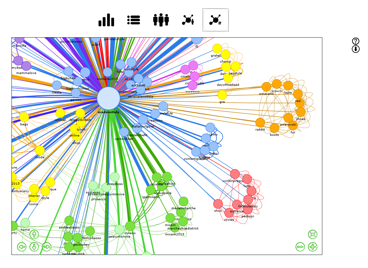 In addition to user interactions network and hashtag copresence network other two interesting network analytics are available: Emoji copresence network and words copresence network.